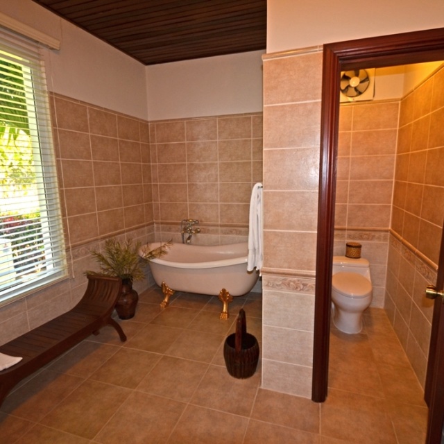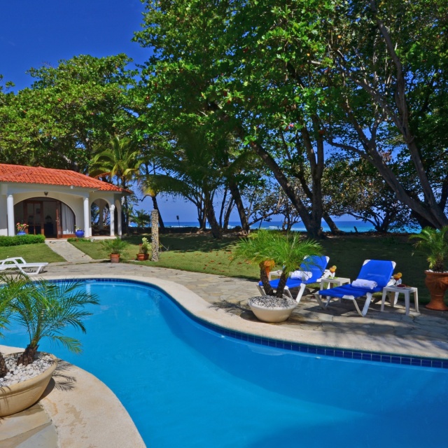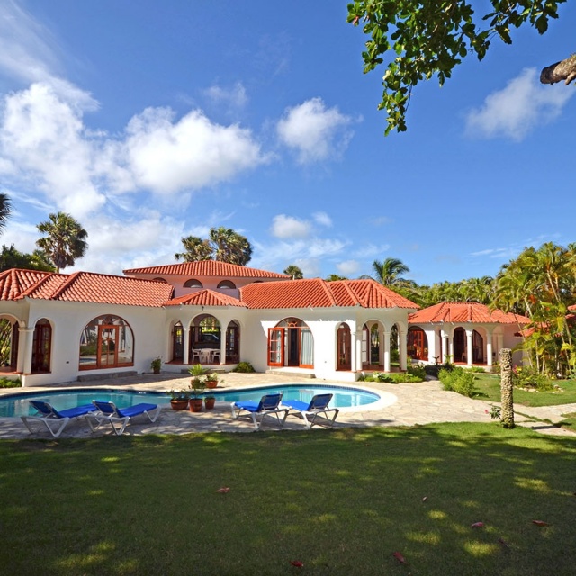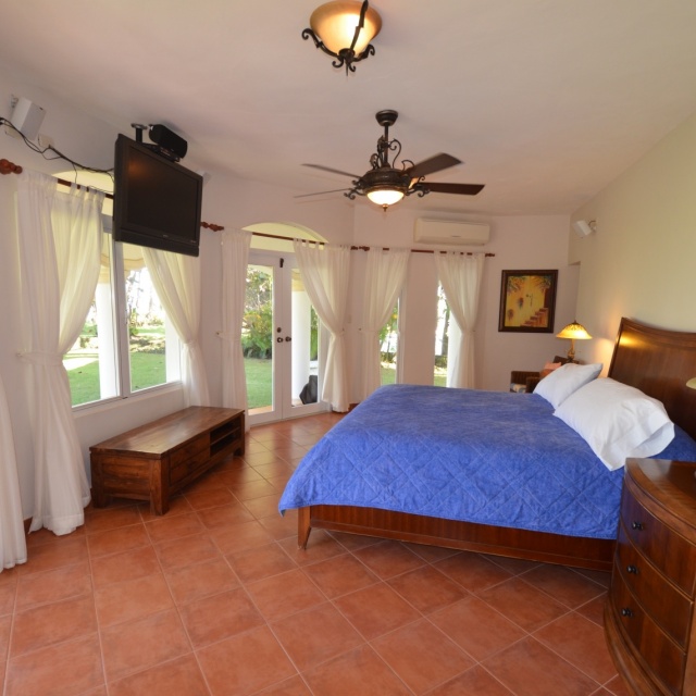 The first one is #0243: it has 5 bedrooms, 5 bathrooms, private swimming pool, Jacuzzi and luxury accommodations that include a cinema room, air conditioned dining room, second level master suites and all the essential amenities. 4 of its suites have king beds and one has a queen size one. The beach and garden areas are exquisitely beautiful, lush green palms set against golden sands and turquoise blue ocean.