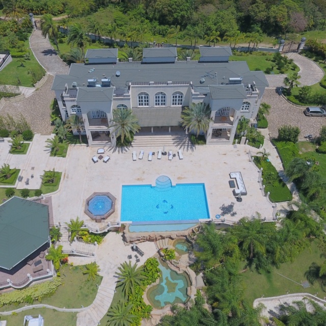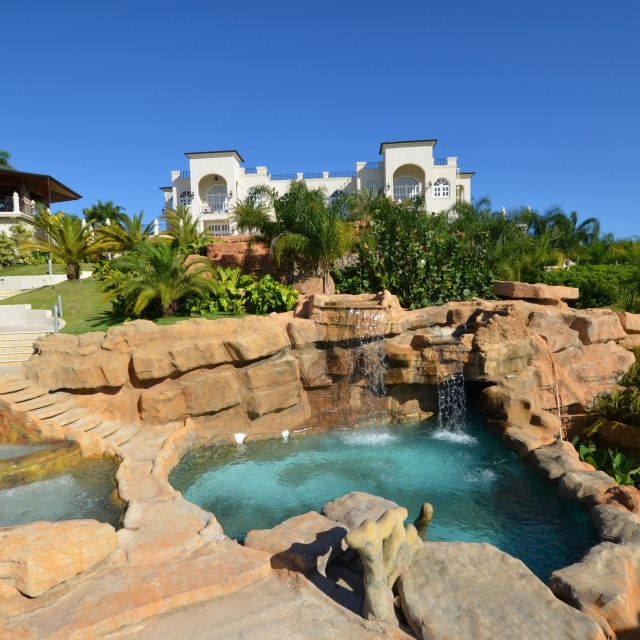 The ultimate VIP experience awaits the guests of this boutique-resort style luxury villa, set on an elevated land overlooking a green landscape with 100-degree views of the Atlantic Ocean. This private compound includes several swimming pools: an Infiniti one in the main building that cascades into various natural-looking whirlpools, the bottom one including a waterfall over the entrance of a grotto-styled jacuzzi with lounge area and led lighting ( literally a man-made cave with real-looking rock design ).