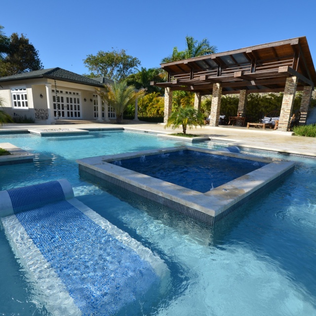 The large pool deck in the main villa includes lounge furniture and chaise lounges, and enough space to host large alfresco dinners and live music shows. A 12 persons jacuzzi sits next to the pool, and next to it there is a large gazebo bar with powerful Bose sound system, bartender and bar stools from where the views can`t get any better. Further on, the bungalows ( 4 ) have their own swimming pool with wet tanning beds and Jacuzzi, the perfect place for aquaerobics and water yoga.