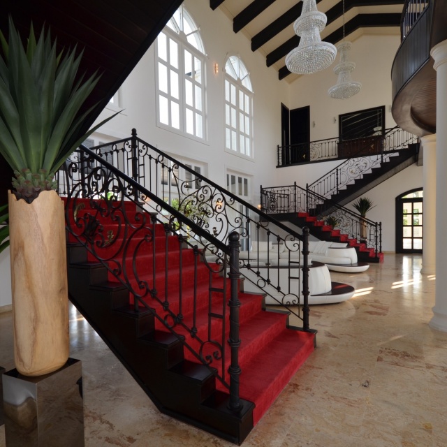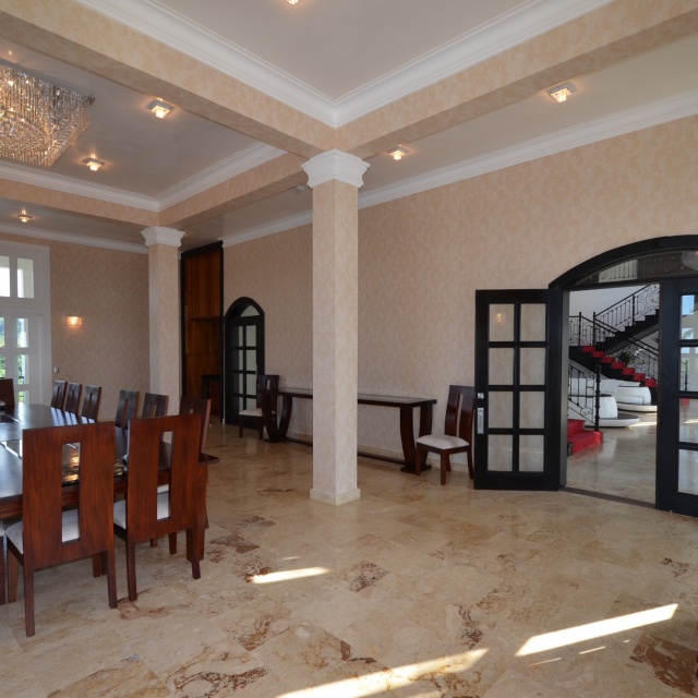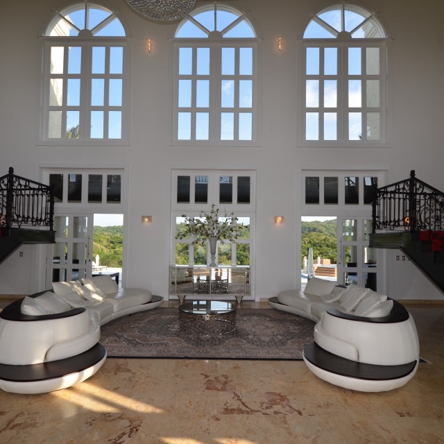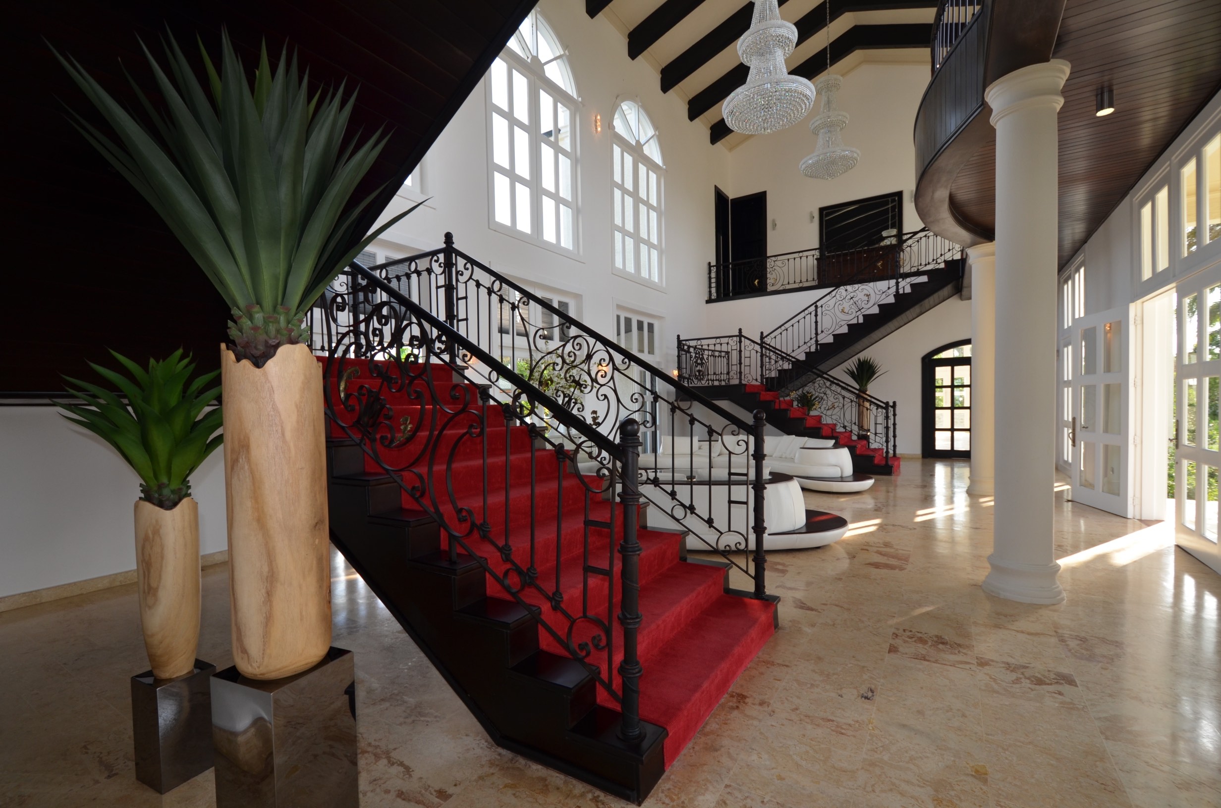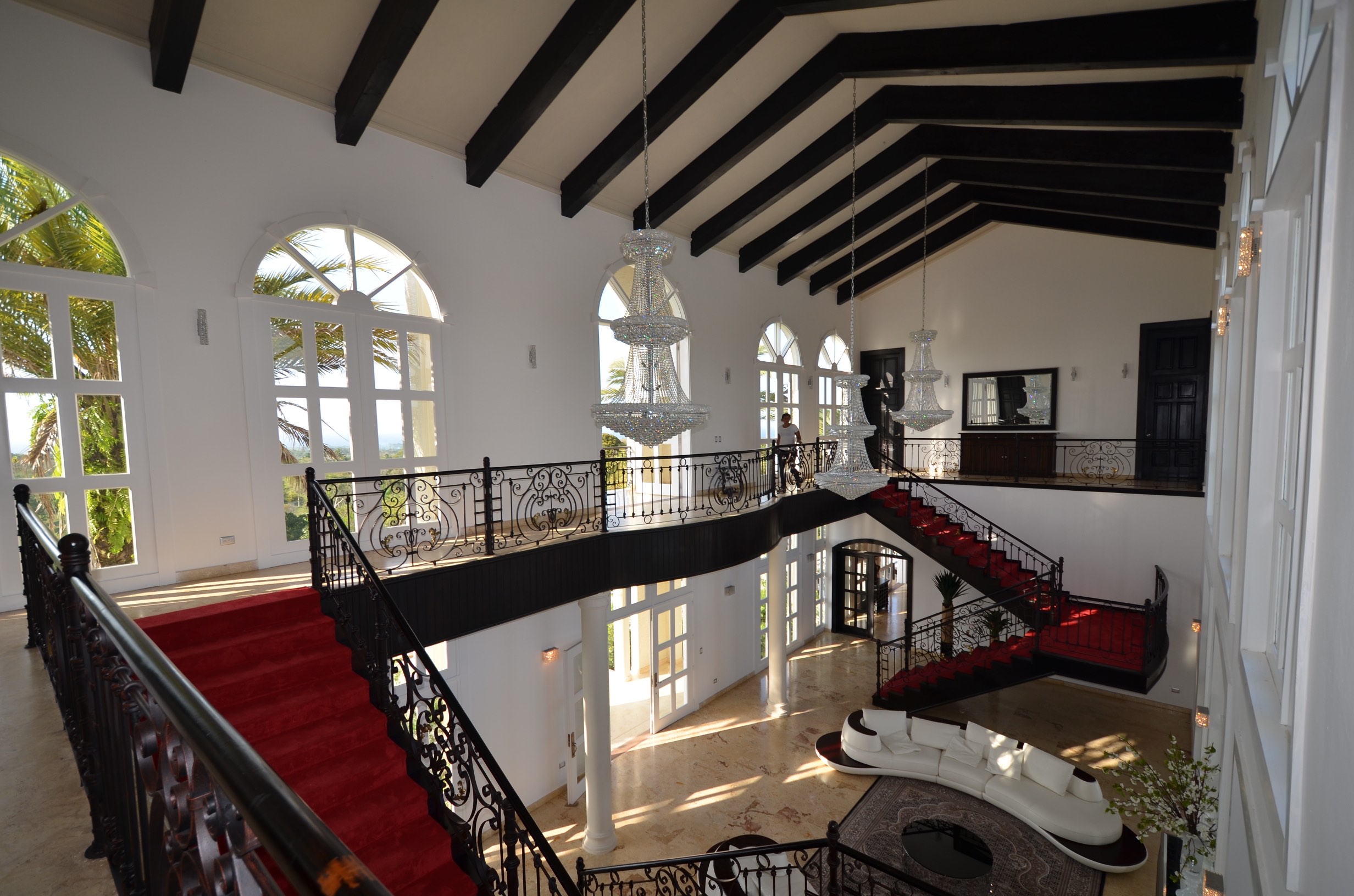 The ample dining room to the left has damask-covered walls, high ceilings and marble flooring. The kitchen has a full staff of chefs, assistants and waiters. On the second level, there are six main suites, two facing the ocean side (North), two on the forest view/pool deck landscape side (South) and two in between with partial views to both North and South.
